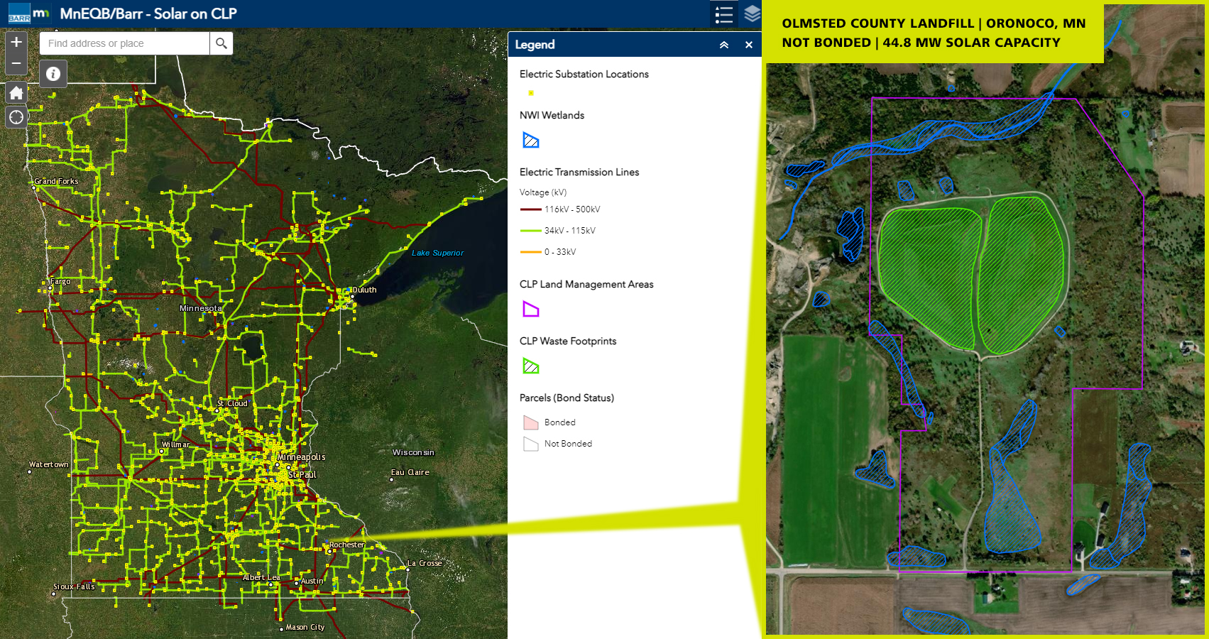 Solar potential: There is significant technical potential for solar development on Minnesota’s CLP sites. The technical assessment estimated that there is potential to generate 950 megawatts AC (MW) using solar on 4,500 acres in the CLP, or enough to power over 100,000 homes.
